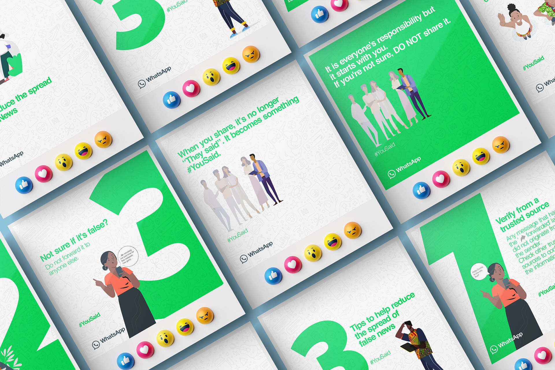 Carousel design educating WhatsApp users on how not to spread false news